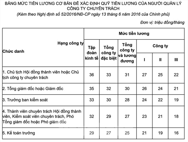 Từ năm 2013 tới nay, lương của người quản lý doanh nghiệp (DN) nhà nước giữ 100% vốn được tính theo bảng lương cơ bản tính theo chức vụ và xếp hạng DN, trường hợp lợi nhuận kế hoạch năm sau cao hơn năm trước, sẽ được tính theo hệ số tăng thêm. Hệ số tăng thêm từ 0,5 – 1 lần lương cơ bản áp dụng với lãnh đạo DN nhà nước được tính theo lợi nhuận của từng nhóm ngành nghề (ngân hàng, tài chính, viễn thông, dầu khí, khoáng sản, điện, thương mại, dịch vụ). Trường hợp lợi nhuận thực tế vượt kế hoạch, mỗi 1% lợi nhuận vượt lương lãnh đạo DN nhà nước sẽ được cộng thêm 1%, nhưng không quá 20% tiền lương bình quân kế hoạch.