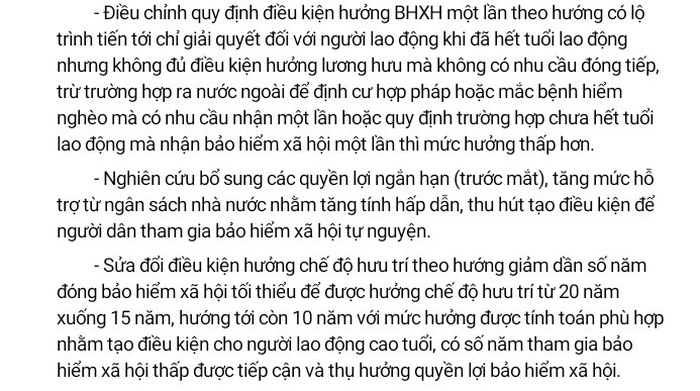 Đồng thời, sửa đổi điều kiện hưởng chế độ hưu trí theo hướng giảm dần số năm đóng bảo hiểm xã hội tối thiểu để được hưởng chế độ hưu trí từ 20 năm xuống 15 năm, hướng tới còn 10 năm với mức hưởng được tính toán phù hợp.