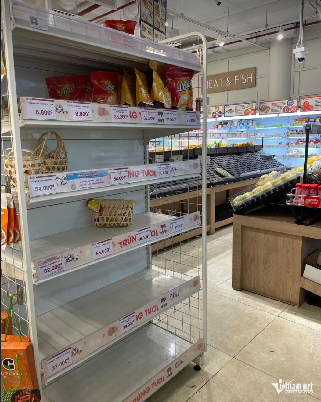 Tại siêu thị Aeon Linh Đàm, quầy rau cũng trống, kệ trứng gia cầm chỉ còn 2-3 giỏ là “cháy hàng”. Khu vực bày bán thịt Meat Deli, hàng vừa được bổ sung lên kệ, khách đã “dọn sạch” ngay.