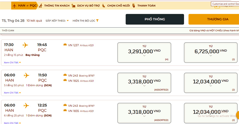 Chẳng hạn, với đường bay Hà Nội - Phú Quốc, giá vé máy bay chiều đi từ ngày 28/4 và về ngày 2-3/5 mở bán trên hệ thống của Vietnam Airlines lần lượt là 3,3-4,12 triệu đồng/chặng. Tại Vietjet Air, giá vé chặng đi khoảng 1,96 triệu đồng, chặng về sáng sớm 1,3-1,5 triệu đồng, giờ đẹp 2,5 triệu đồng (chưa gồm thuế, phí). Còn với Bamboo Airways, giá vé trung bình khoảng 2-2,5 triệu đồng/chặng (chưa gồm thuế, phí).