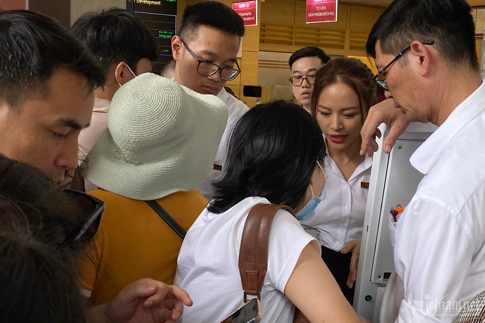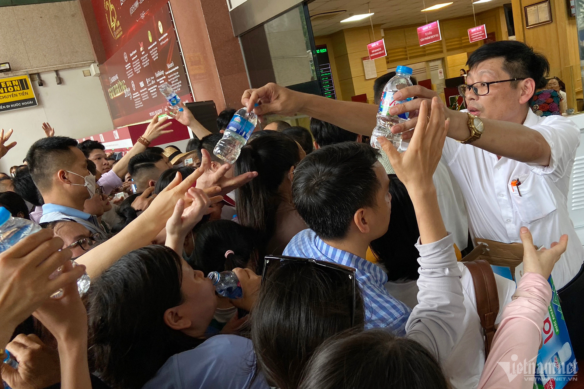 13h34, ngân hàng mở khe cửa nhỏ đón từng khách theo số thứ tự vào để tránh vỡ trận. Nhân viên yêu cầu khách xếp hàng dọc để vào lấy số thứ tự tại máy nhưng nhiều người đã phản ứng dữ dội vì tình trạng hỗn loạn, không thể biết ai đến trước, ai đến sau. Cảnh không ai chịu nhường ai cũng xảy ra.