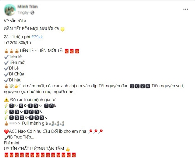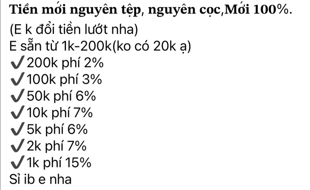 Tại Fanpage của cư dân một chung cư ở quận Nam Từ Liêm (TP Hà Nội) với hàng chục ngàn thành viên, tài khoản Facebook L.N đăng bài quảng cáo đổi tiền mới với lời rao hấp dẫn: "Đổi sớm, phí đang cực tốt". Theo đó, mức phí đổi tiền mới mệnh giá 200.000 đồng là 2%, mệnh giá 100.000 đồng là 3%. Với tiền mệnh giá nhỏ hơn như 50.000, 10.000 và 5.000 đồng, phí đổi tiền sẽ cao hơn, ở mức 6% - 7%. Trong vai người có nhu cầu đổi tiền, chúng tôi liên hệ với chủ tài khoản L.N thì được người này cho biết năm nay, tiền mới khan hiếm nên chỉ những người đổi sớm mới có phí thấp như thông báo. Càng cận Tết - khi nguồn tiền mới ngày càng cạn, phí đổi sẽ cao hơn nữa.
