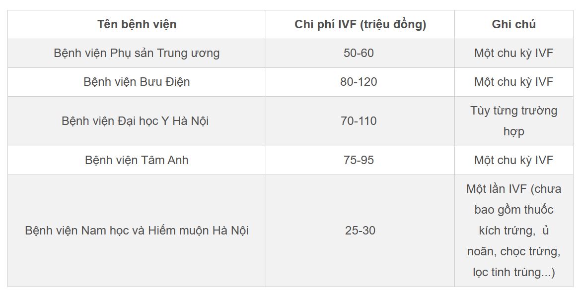 Bảng giá tham khảo kỹ thuật hỗ trợ sinh sản IVF tại một số bệnh viện ở Hà Nội: