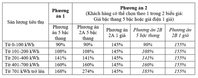 Theo đó, với giá bán lẻ điện bình quân hiện hành là 1.864,44 đồng/kWh, người dùng sẽ phải trả khoảng 2.703 đồng/kWh (chưa gồm thuế VAT) nếu chọn phương án 145% và khoảng 2.890 đồng/kWh (chưa gồm thuế VAT) nếu chọn phương án 155%.