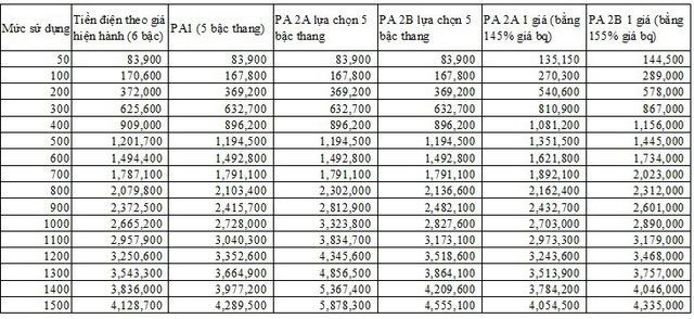 Nếu so sánh trong nội bộ từng phương án giữa một giá và biểu giá điện bậc thang thì 92,9% số hộ dùng điện trả tiền điện tăng thêm từ 15.000 - 102.500 đồng (2A) và 52.000 - 122.100 đồng/hộ/tháng (2B). Còn lại 7,1% số hộ tiền dùng điện được giảm từ 83.000 - 240.000 đồng (2A) và 27.900 - 355.000 đồng/hộ/tháng (2B).