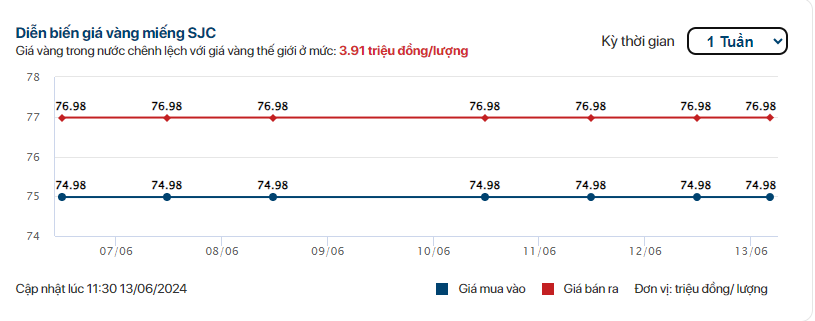 Đến sáng hôm nay (13/6), giá vàng miếng SJC do 4 ngân hàng thương mại Nhà nước gồm Agribank, BIDV, Vietcombank và VietinBank công bố tiếp tục giữ nguyên mức cũ, 76,98 triệu đồng/lượng. Đây cũng là phiên thứ 6 liên tiếp giá vàng miếng SJC được các ngân hàng bán ra ở mức 76,98 triệu đồng/lượng.