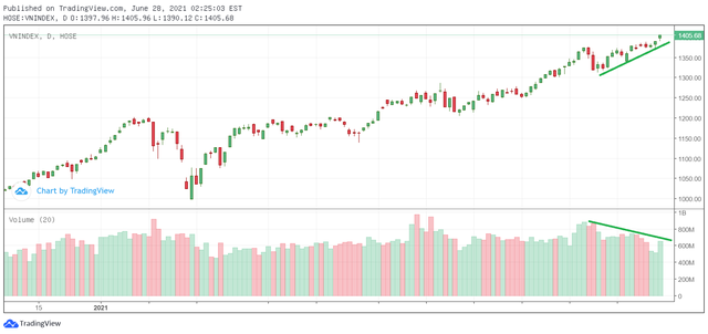 Yếu tố đầu tiên khiến thanh khoản thị trường đột ngột giảm mạnh trong nửa cuối tháng 6 có thể đến từ tâm lý thận trọng của giới đầu tư. Kể từ khi tạo đáy tại vùng 650 điểm vào cuối quý 1/2020, chỉ số VN-Index đã có cú bứt phá ngoạn mục, liên tiếp thiết lập những đỉnh cao mới. Đà tăng của VN-Index có phần khá dễ dàng khi gần như không có nhịp điều chỉnh mạnh thực sự nào khiến nhiều nhà đầu tư có kinh nghiệm phần nào cẩn trọng hơn.