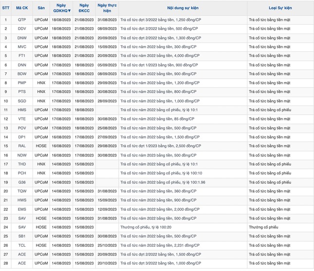 Tuần tới, 28 doanh nghiệp trên sàn thông báo chốt quyền cổ tức. Trong đó, 23 doanh nghiệp chia cổ tức tiền mặt. Mức cao nhất lên tới 278%.