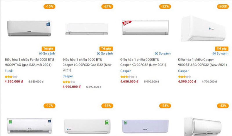 Đặc biệt, một số mẫu điều hòa đời 2021 có giá chỉ từ 4 triệu đồng, như: điều hòa 1 chiều 9000BTU Dairry DR09-SKC giảm giá từ 5,1 triệu đồng còn 4,3 triệu đồng; mẫu điều hòa 1 chiều Casper 9000BTU SC-09FS32 hiện còn 4,5 triệu đồng thay vì mức giá cũ là 4,7 triệu đồng; điều hòa luxury 9000BTU Dairry DR09-LKC có giá 4,6 triệu đồng; điều hòa 1 chiều 9000 BTU Casper LC-09FS32 giảm từ 6,5 triệu đồng còn 4,9 triệu đồng…