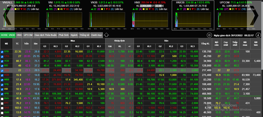 Trước đó, trong 3-4 phiên cuối năm 2022, tâm lý thận trọng vẫn bao trùm toàn thị trường. Tuy nhiên, dòng tiền đổ mạnh vào các mã cổ phiếu Vietinbank (CTG), BIDV (BID), Vietcombank (VCB), Sacombank (STB), VPBank (VPB).... Khối ngoại tiếp tục mua ròng nhiều mã cổ phiếu VCB, CTG, STB, BID…