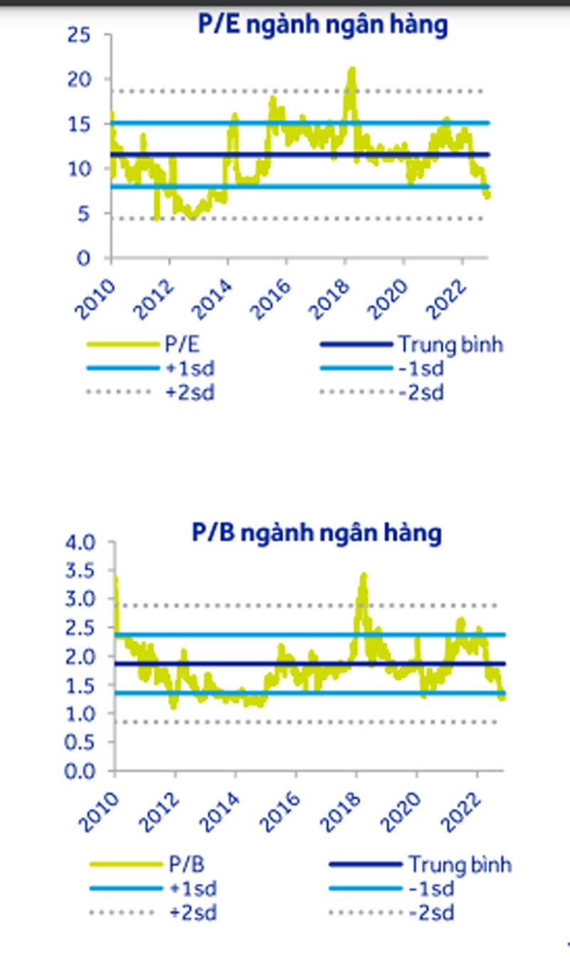 Trong một báo cáo mới đây, Chứng khoán ACB (ACBS) cho biết đợt sụt giảm mạnh của thị trường đã đưa giá cổ phiếu ngân hàng về vùng hấp dẫn. Theo đó, hồi cuối tháng 11, cổ phiếu ngành ngân hàng được giao dịch với chỉ số giá/thu nhập (P/E) ở mức 7,1 lần và giá/giá trị sổ sách (P/B) là 1,3 lần, thấp hơn lần lượt 38,1% và 29,6% so với trung bình lịch sử giai đoạn 2010-2022.