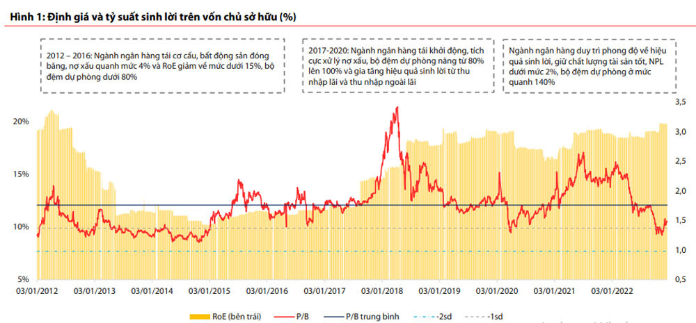 Theo chuyên gia Phạm Tâm của VDSC, mặc dù đứng trước những rủi ro bất định từ vĩ mô thế giới cùng với nội tại nền kinh tế, VDSC, cho rằng định giá ngành ngân hàng đã về mức thấp trong 10 năm qua. Do đó, khó khăn phía trước sẽ mang lại cơ hội lựa chọn và tích lũy cổ phiếu và nắm giữ dài hạn cho hành trình phục hồi và tăng trưởng trở lại từ năm 2024.