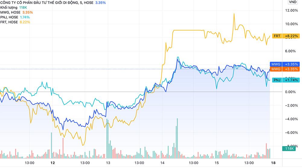 Chốt phiên giao dịch 15/4, giá cổ phiếu MWG của CTCP Đầu tư Thế Giới Di Động chốt phiên ở mức 160.200 đồng/cp. Thị giá MWG đã tăng hơn 17% từ đầu năm trong khi thị trường chung vẫn đi ngang. Vốn hóa theo đó lập kỷ lục 117.270 tỷ đồng, cao hơn 80% so với thời điểm 1 năm trước.