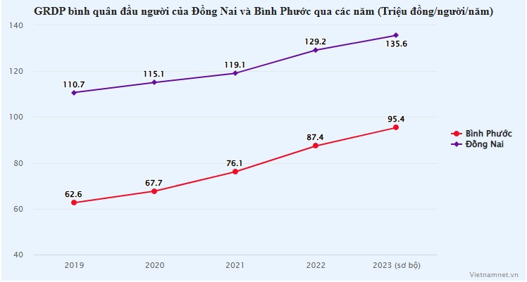 Trong khi đó, GRDP bình quân đầu người của Bình Phước chỉ đạt 95,4 triệu đồng/người/năm, thấp hơn 7,5 triệu đồng so với mức bình quân của cả nước và thấp hơn 40,2 triệu đồng so với mức bình quân của Đồng Nai.