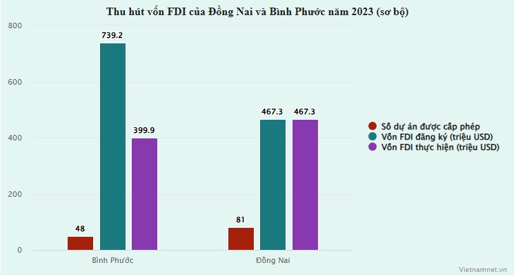 Theo đó, số liệu sơ bộ năm 2023, Bình Phước có 48 dự án được cấp phép với vốn FDI đăng ký là 739,2 triệu USD, vốn thực hiện 399,9 triệu USD; Đồng Nai có 81 dự án được cấp phép, vốn FDI đăng ký là 467,3 triệu USD và vốn thực hiện cũng là 467,3 triệu USD.