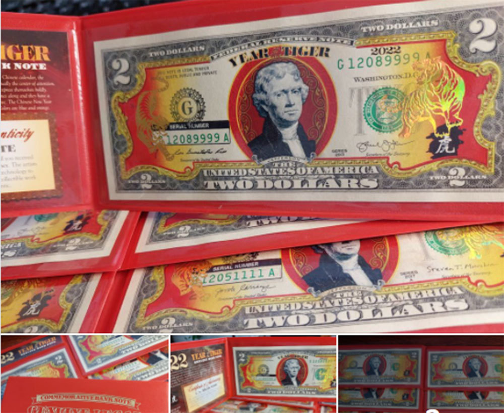 Tiền 2 USD in hình hổ mạ vàng được chia làm hai loại, chủ yếu là số seri đẹp và số seri theo năm sinh. Tờ tiền này được phát hành tại Mỹ nhằm phục vụ nhu cầu lì xì trong dịp Tết Âm lịch 2022 của người dân châu Á.