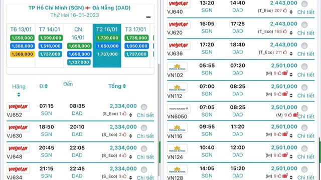 Long cho biết: “Mình tham khảo giá vé bay từ TP.HCM về Huế của hãng Vietnam Airlines thì có giá 2,2 triệu đồng khi bay vào ngày 14.1 và các hãng còn lại cũng giao động từ 1,8 đến 2,5 triệu đồng cho hạng ghế bình thường”.