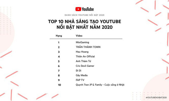 Top 10 nhà sáng tạo YouTube nổi bật năm 2020 theo xếp hạng của Google là: MixiGaming (4,27 triệu người đăng ký); TRẤN THÀNH TOWN (4,53 triệu người đăng ký); Hau Hoang (6,28 triệu người đăng ký); Thiên An Official (3,11 triệu người đăng ký); Anh Thám Tử (1,91 triệu người đăng ký); Cris Devil Gamer (9,22 triệu người đăng ký); Di Di (2,51 triệu người đăng ký); Gãy Media (2,05 triệu người đăng ký); FAP TV (12,1 triệu người đăng ký); Quynh Tran JP & Family - Cuộc sống ở Nhật (3,57 triệu người đăng ký)