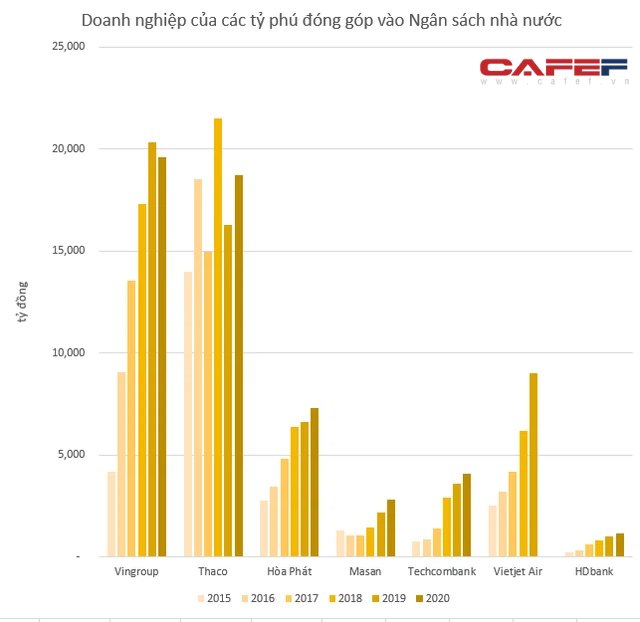 Trong năm 2020, tập đoàn của tỷ phú Phạm Nhật Vượng đã nộp tổng cộng 19.614 tỷ đồng vào ngân sách nhà nước. Trong đó, có xấp xỉ 9.397 tỷ đồng thuế thu nhập doanh nghiệp thu nhập doanh nghiệp, tăng gần 19% so với năm 2019. Giai đoạn 5 năm 2016-2020, Vingroup đã nộp tổng cộng 79.813 tỷ đồng vào ngân sách. Số đóng góp vào ngân sách của Vingroup liên tục tăng qua các năm, chỉ giảm nhẹ vào năm Covid-19 2020.