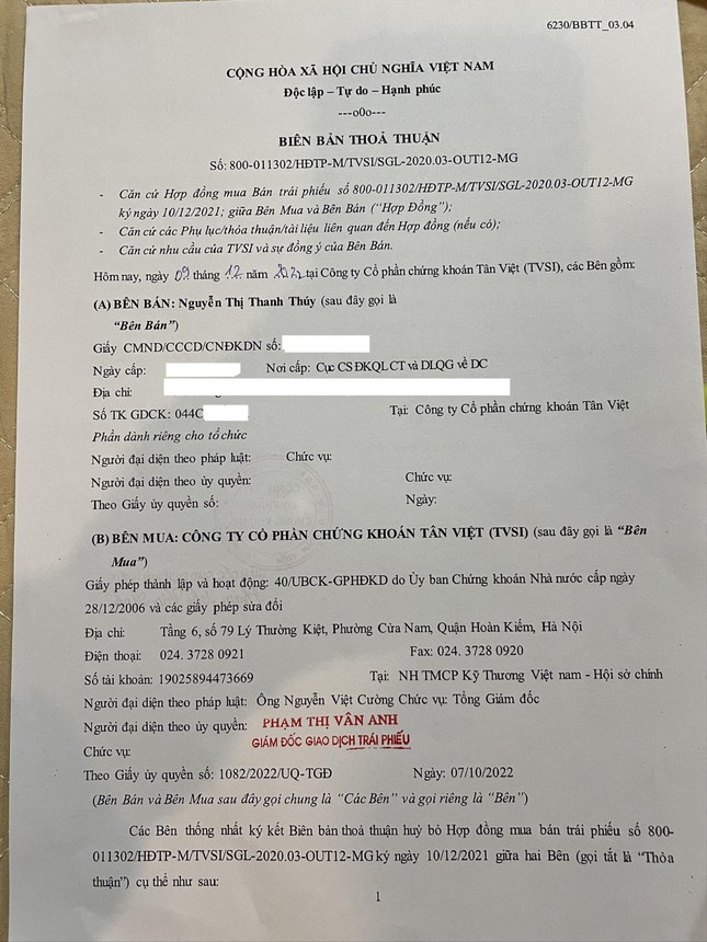 “Chia sẻ khó khăn với doanh nghiệp, tôi cũng đồng ý gia hạn hợp đồng, tuy nhiên, gặp tôi, nhân viên chỉ đưa một tờ biên bản thỏa thuận soạn sẵn với nội dung hủy bỏ và chấm dứt hợp đồng mua bán trái phiếu mà tôi đã ký với Công ty Chứng khoán Tân Việt. Khi thấy nhân viên công ty này liên tục giục ký nhanh, tôi đã nghi ngờ nên không ký. Về nhà đọc kỹ hợp đồng mới phát hiện họ đang lừa mình bằng cách cài điều khoản hủy bỏ hợp đồng trong biên bản thỏa thuận để không mua lại trái phiếu đã phát hành”, chị Thúy cho hay.