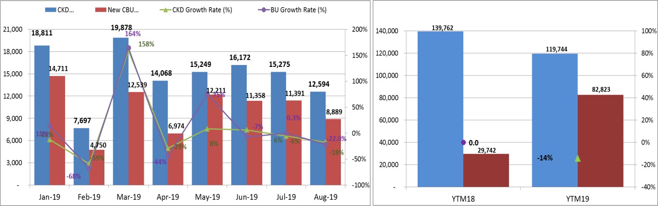 Tính riêng trong tháng 8/2019, doanh số số bán hàng của toàn thị trường đạt 21.483 xe, giảm 19% so với tháng 7/2019 dù nhiều đơn vị khuyến mại lớn.