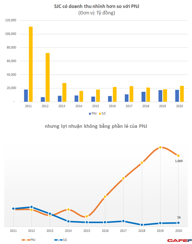 Năm 2020, doanh thu PNJ đạt 17.511 tỷ đồng, tăng 3%. Tăng trưởng thấp của PNJ là do ảnh hưởng của đại dịch COVID-19. Trong giai đoạn trước đó, doanh thu của công ty này tăng trưởng từ 20 – 30% mỗi năm. Biên lợi nhuận gộp trong năm 2020 đạt 19,4%, biên lợi nhuận ròng 6%, đều là các chỉ số vượt trội so với SJC.