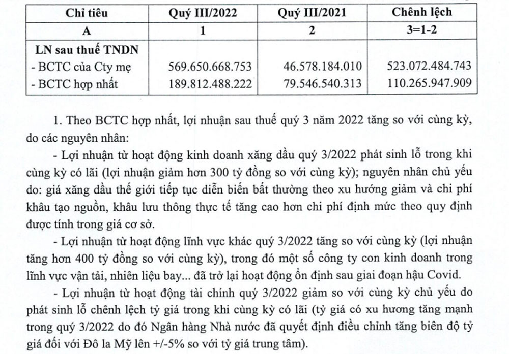Tuy nhiên, trong báo cáo giải trình, Petrolimex cho biết, hoạt động kinh doanh xăng dầu quý III/2022 vẫn phát sinh lỗ do giá xăng dầu thế giới tiếp tục diễn biến bất thường theo xu hướng giảm và chi phí khâu tạo nguồn, khâu lưu thông thực tế tăng cao hơn chi phí định mức theo quy định được tính trong giá cơ sở.
