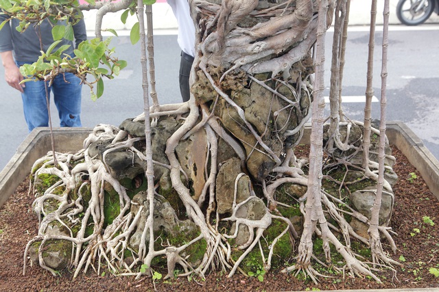 Thoạt nhìn, bệ rễ trắng trườn theo đá lên cao dần nhìn như một dòng suối. Trải qua thời gian cùng với sự kiên trì của người nghệ nhân, các rễ đan xen vào nhau, ôm chặt các mỏm đá trông rất bắt mắt. Ngoài điểm nhấn là các rễ phụ thẳng nối bệ rễ với các cành, người nghệ nhân còn tạo thêm một cành rơi cho cây mềm mại. Một điểm đặc biệt của tác phẩm có một số tay cành lớn được uốn như tay cành cây sanh. Các tay cành lớn nối từ thân cây cũng đã múp sẹo.