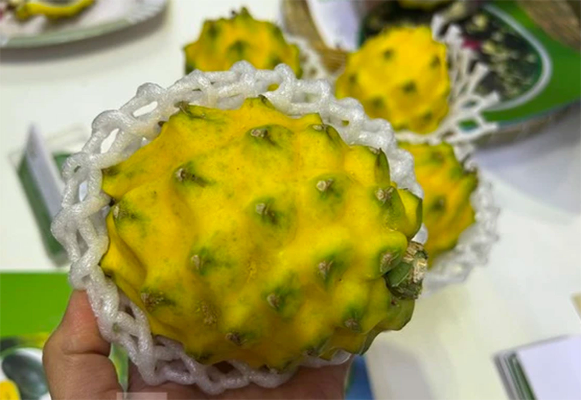 Nhiều người tham quan Triển lãm và hội thảo quốc tế lần thứ 5 chuyên ngành sản xuất và chế biến rau, hoa, quả tại Việt Nam vừa diễn ra tại TP.HCM thích thú khi được mời thưởng thức thanh long vỏ vàng “độc lạ” chỉ to bằng nắm tay, hạt gần bằng hạt chanh dây nhưng có giá tới 300.000 đồng/kg (cao gấp 15 lần thanh long thường).