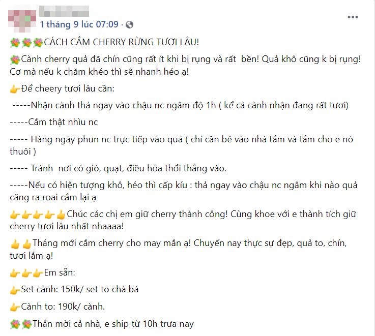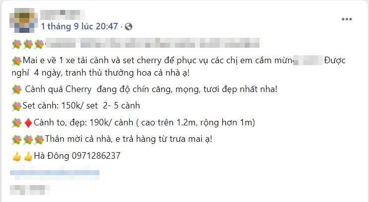 Cành quả cherry rừng Tây Bắc cũng được một vài địa chỉ online bán. Giá dao động từ 150.000 đồng/set gồm 2-5 cành và 190.000 đồng/cành to (cao trên 1,2 mét và rộng hơn 1m).