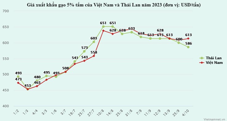 Trái với xu hướng ổn định và neo ở mức cao của gạo Việt Nam, giá gạo của các đối thủ cạnh tranh lại tiếp đà giảm mạnh. Cụ thể, sau khi tăng vọt lên mức 651 USD/tấn, gạo 5% tấm của Thái Lan quay đầu lao dốc, ngày 4/10 về mức 586 USD/tấn; gạo 5% tấm giảm còn 538 USD/tấn.