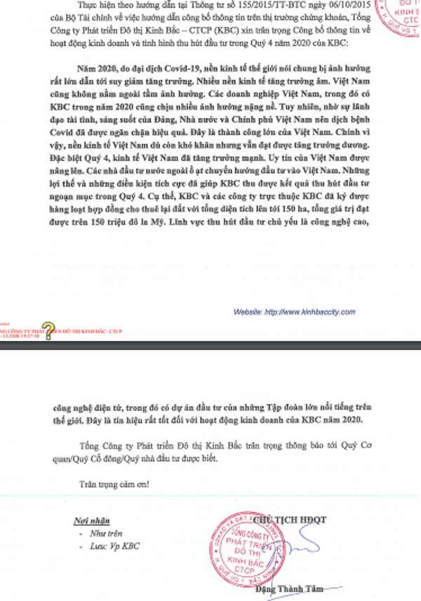 Thông tin từ Phát triển Đô thị Kinh Bắc cho biết, doanh nghiệp này vừa ký được hàng loạt hợp đồng cho thuê đất với tổng diện tích 150ha, tổng giá trị 150 triệu USD. Đây là những diễn biến tích cực trong quý IV.
