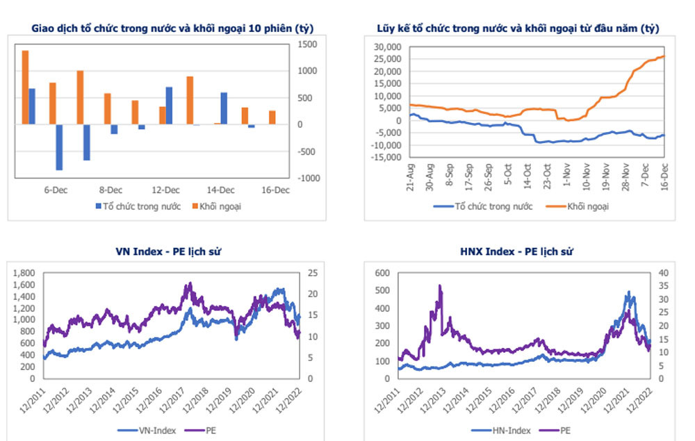 Thị trường chứng khoán Việt Nam trong tuần 12-16/12 chứng kiến sự giằng co giữa bên mua và bên bán với phiên giảm mạnh đầu tuần, sau đó hồi phục và tích lũy trong vùng cân bằng. Cụ thể, tâm lý thận trọng trước thềm công bố lạm phát Mỹ đã khiến chỉ số VN-Index giảm 1,9% ngay trong phiên đầu tuần.