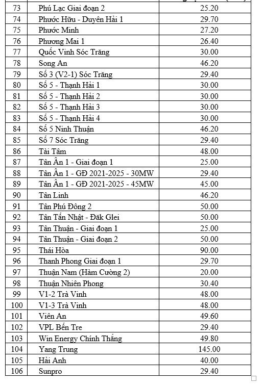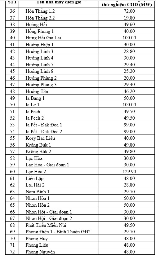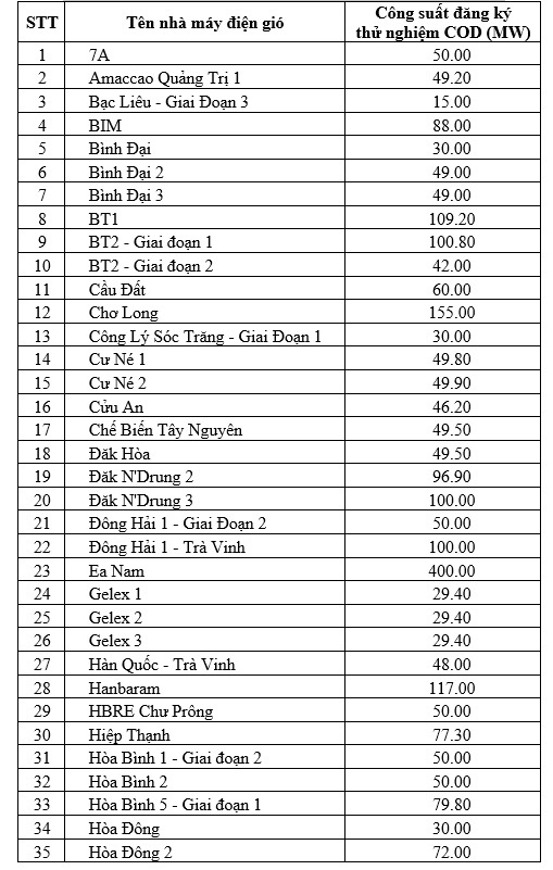Tổng công suất đăng ký thử nghiệm COD của 106 nhà máy điện gió này là hơn 5.655 MW.