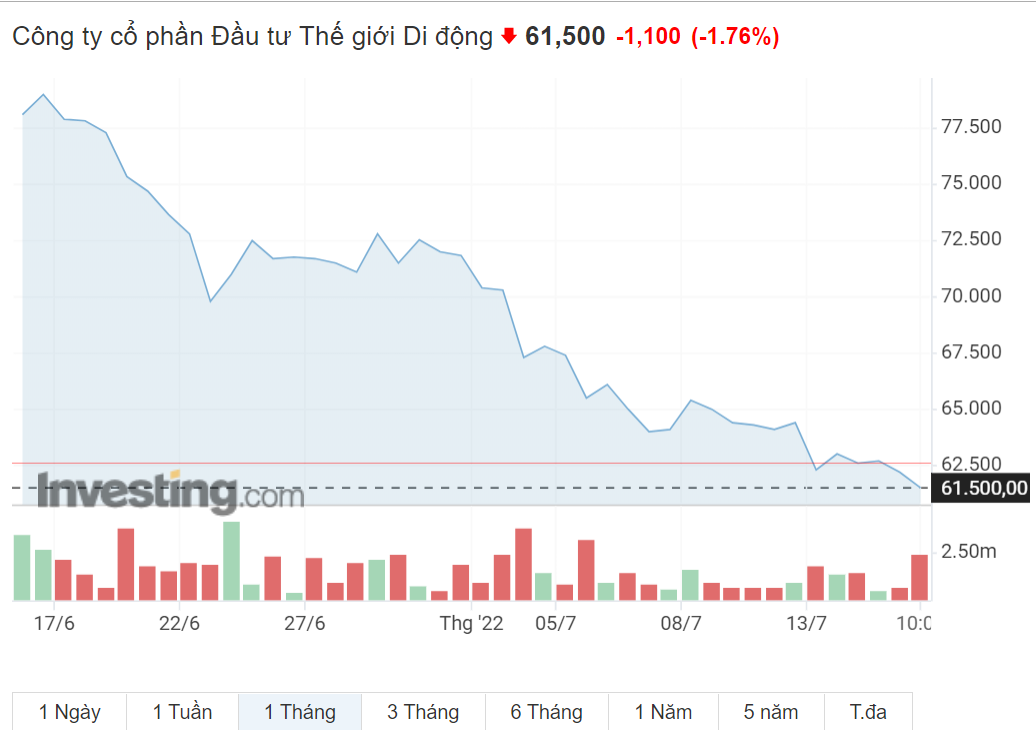 Kết thúc phiên giao dịch ngày 15/7, cổ phiếu MWG do đại gia Nguyễn Đức Tài làm chủ tịch ghi nhận giảm 1.100 đồng/cp, tương đương giảm 1,8% còn 61.500 đồng/cp, đây cũng là phiên giảm thứ 5 liên tiếp. Không những vậy, kể từ đầu tháng 7, cổ phiếu MWG giảm 10.000 đồng/cp, tương đương mức giảm 14%.