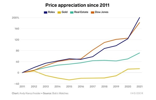 Dữ liệu của Bob's Watches cho thấy rằng khi xem xét tỷ lệ phần trăm tăng lên, đồng hồ Rolex vượt trội hơn đáng kể so với cả vàng và bất động sản.