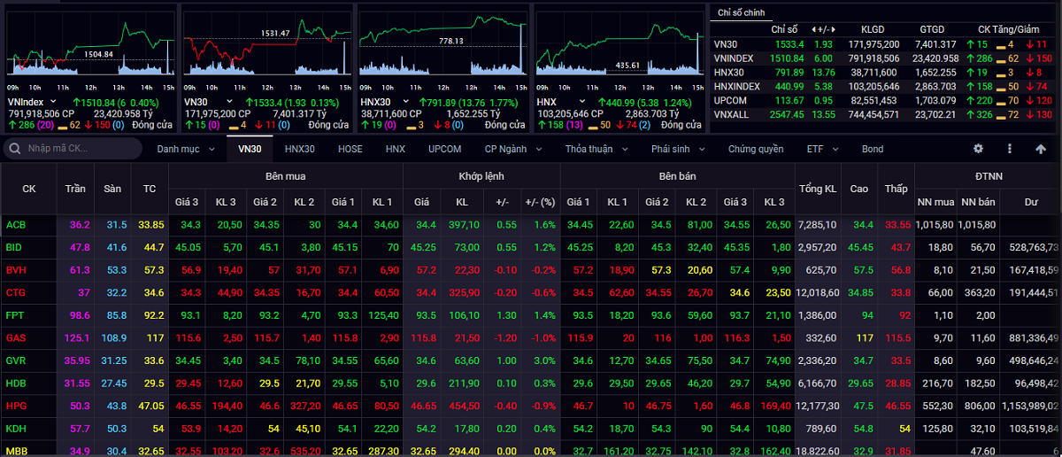 Thị trường chứng khoán khởi đầu tuần mới trong sắc xanh tích cực và đáng chú ý nhất là việc thanh khoản có sự cải thiện và ở mức cao hơn trung bình sau bốn tuần liên tiếp thấp hơn mức này. Cụ thể, kết thúc phiên giao dịch ngày 21/2, chỉ số VN-Index tăng 6 điểm (+0,4%) lên 1.510,84 điểm. Độ rộng thị trường là tích cực với 268 mã tăng (20 mã tăng trần), 62 mã tham chiếu, 150 mã giảm (0 mã giảm sàn).