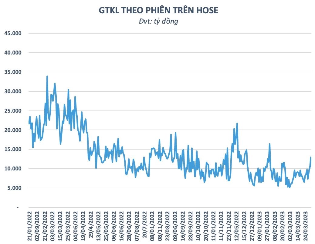 Dòng tiền dồn dập đổ vào thị trường kéo thanh khoản khớp lệnh trên HOSE tăng vọt 24% so với phiên trước đó, đạt 12.983 tỷ đồng. Dù con số này chẳng thấm vào đâu so với giai đoạn bùng nổ trước đó, song cũng là mức thanh khoản khớp lệnh cao thứ hai kể từ đầu năm đến nay.