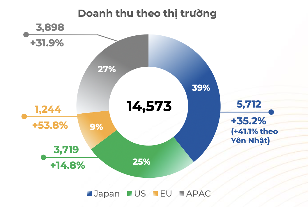 Nhắc đến Nhật Bản, không thể bỏ qua FPT khi đây là thị trường nước ngoài lớn nhất của tập đoàn công nghệ hàng đầu Việt Nam. 6 tháng đầu năm, mảng Dịch vụ CNTT nước ngoài mang về cho FPT 14.573 tỷ đồng, tăng gần 30% so với cùng kỳ 2023. Trong đó, thị trường Nhật Bản đóng góp hơn 5.700 tỷ đồng (tỷ trọng 39%), tăng 35% so với cùng kỳ năm ngoái.