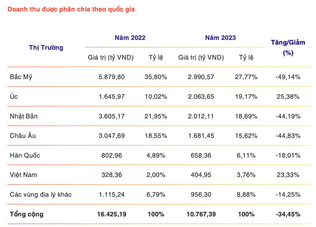 Câu chuyện tương tự với các doanh nghiệp thuỷ sản khi Nhật Bản lâu nay vẫn là một trong những thị trường xuất khẩu lớn nhất của Việt Nam, đặc biệt là tôm. Như trường hợp của Thuỷ sản Minh Phú (MPC), Nhật Bản là thị trường xuất khẩu lớn thứ 3 của doanh nghiệp này, sau Bắc Mỹ và Úc. Năm 2023, thị trường Nhật Bản mang về hơn 2.000 tỷ đồng doanh thu cho MPC, giảm hơn 44% so với cùng kỳ 2022 và chiếm 18,7% tổng doanh thu.