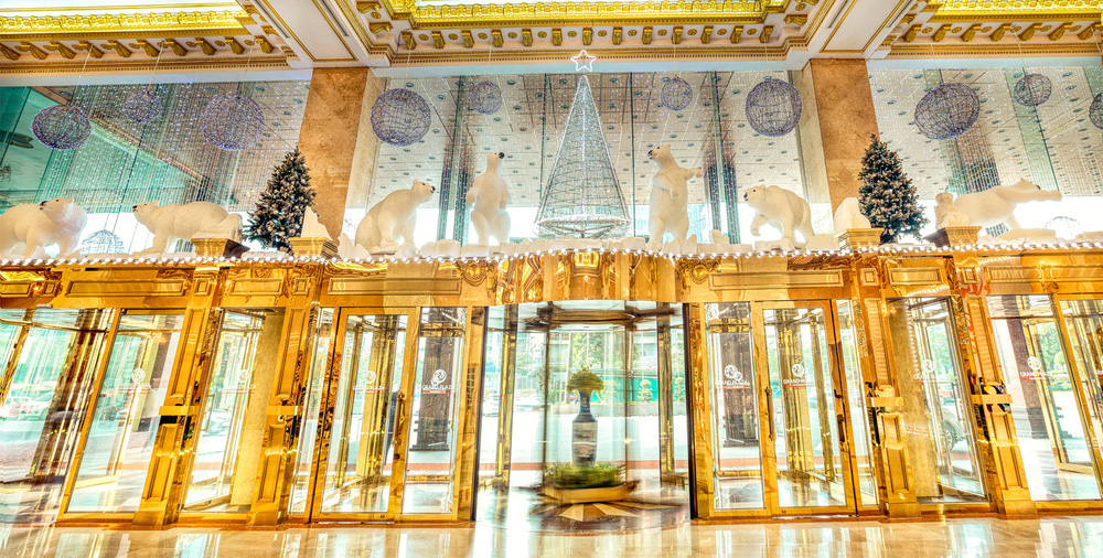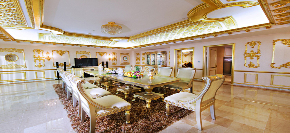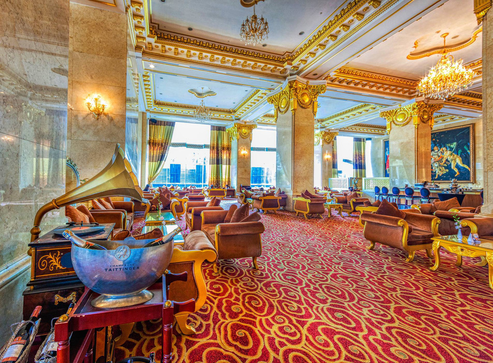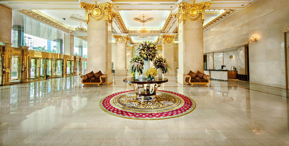 Điểm đặc biệt là rất nhiều hoa văn trang trí tại khách sạn này được dát vàng lá rất tinh xảo từ trần hành lang cho đến cột trụ cao.