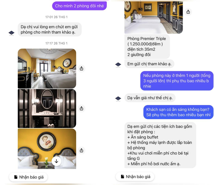 "Lần gần đây nhất, tôi tìm khách sạn tại Sa Pa để cùng gia đình du xuân. Tôi để ý một khách sạn 5 sao rất nổi tiếng và tìm liên hệ trên Facebook. Vì chủ quan, tôi không để ý rằng trang page này không có dấu tick xanh. Họ đưa các mức phòng rất sang trọng với giá rất hời, lại còn không phụ thu ngày Tết, bao gồm cả bữa sáng thậm chí thêm người cũng không tính phí. Điều này khiến tôi bắt đầu nghi ngờ, vì đi du lịch nhiều nơi tôi chưa từng thấy chính sách nào ưu đãi đến mức đó.