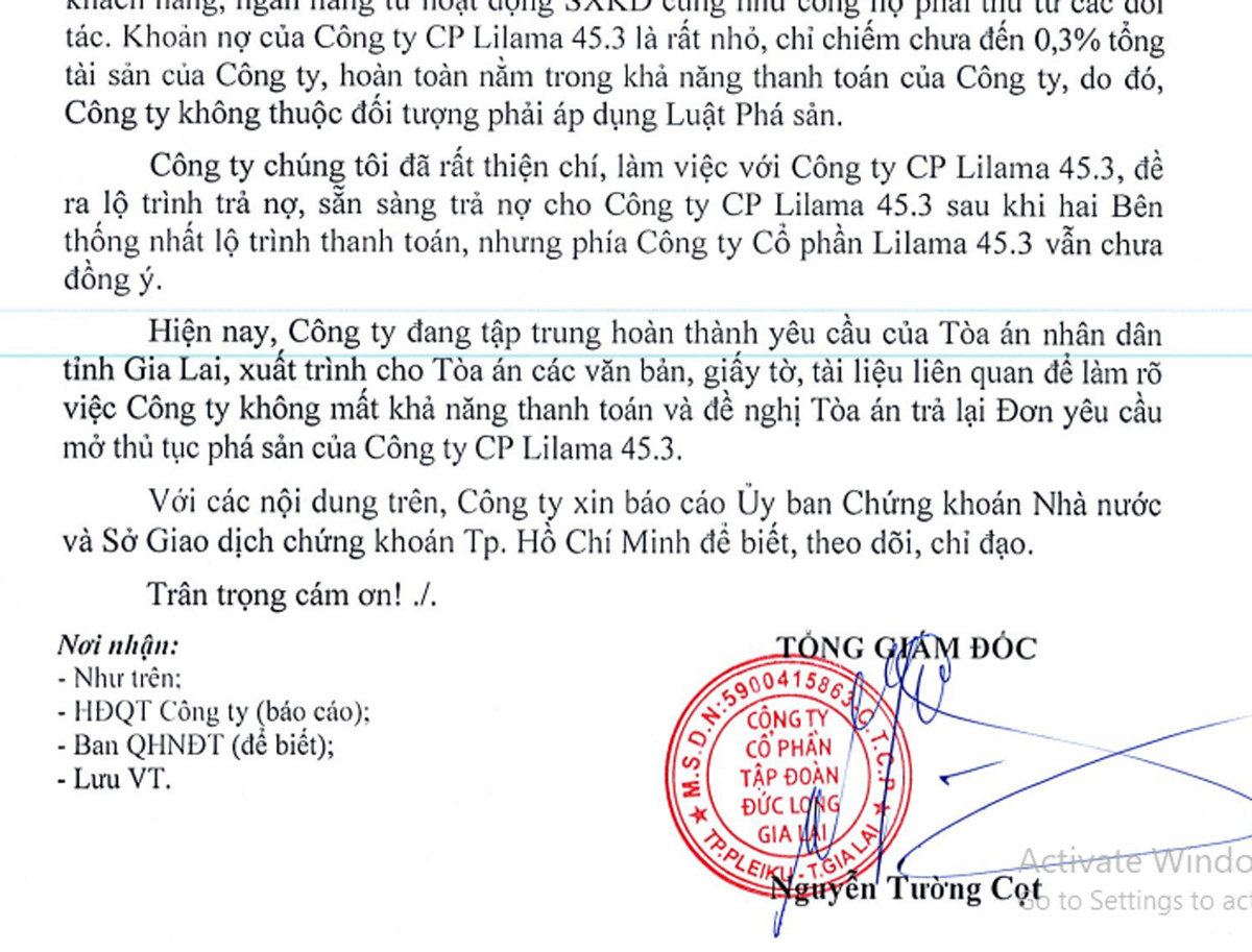 Trước đó, ngày 25/7, Công ty Lilama 45.3 có đơn gửi Tòa án Nhân dân Gia Lai yêu cầu mở thủ tục phá sản với Tập đoàn Đức Long Gia Lai vì không đòi được khoản nợ 20 tỷ đồng.