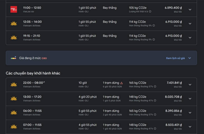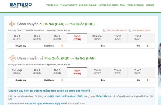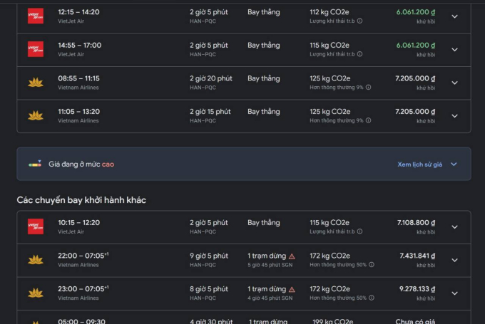 Trong đó, chặng Hà Nội - Phú Quốc đắt vô lý một số chuyến bay đã hết vé rẻ, chỉ còn vé khá cao. Cặp vé khứ hồi hạng phổ thông từ 28/4 và trở về 2/5, hành khách bay chặng Hà Nội - Phú Quốc dao động từ 7 triệu - 9 triệu đồng. Hạng thương gia của Vietnam Airlines còn lên đến 13 triệu đồng. Các mức giá trên gần gấp đôi chuyến bay giờ đẹp trung tuần tháng 3. Tuy vậy, vé chặng này cũng không còn nhiều lựa chọn.