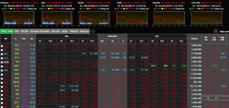 Áp lực bán dâng cao từ ngay khi mở cửa và ngày càng mạnh vào cuối phiên. Lực bán diễn ra trên diện rộng ngay từ đầu phiên với chỉ số VN-Index giảm 35 điểm. Tới cuối buổi sáng, VN-Index giảm 42 điểm, trước khi chốt phiên giảm hơn 57 điểm.