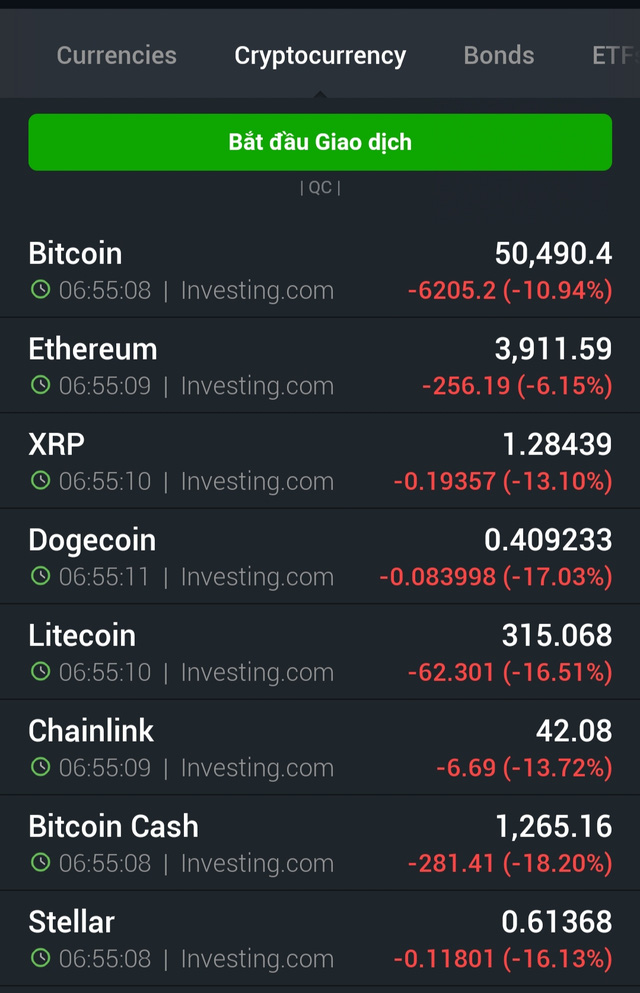 Tuy nhiên, tính tới 6h55 theo giờ Hà Nội, giá Bitcoin đã giảm 6.205 USD, xuống còn 50.490,4/coin, tương đương mức giảm gần 11%. Giá các đồng tiền số khác cũng đồng loạt lao dốc dù không bị Elon Musk nhắc tên trong dòng thông điệp trên Twitter của mình.