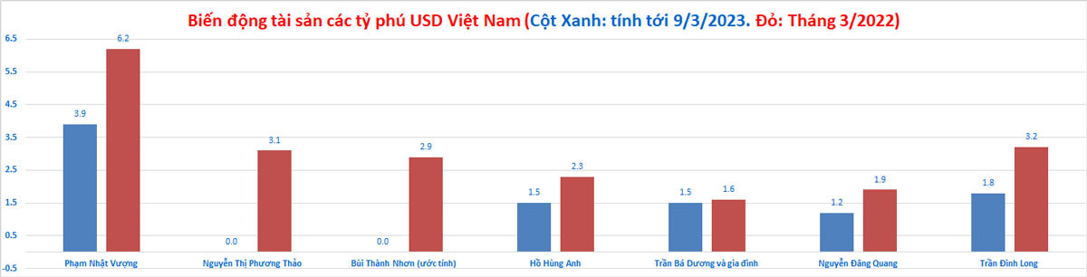 Thống kê cho thấy, tính đến 9/3, cả 5 tỷ phú USD Việt khoảng 9,9 tỷ USD, thấp hơn mức 15,3 tỷ USD (ghi nhận trong bảng xếp hạng hồi tháng 3/2022.
