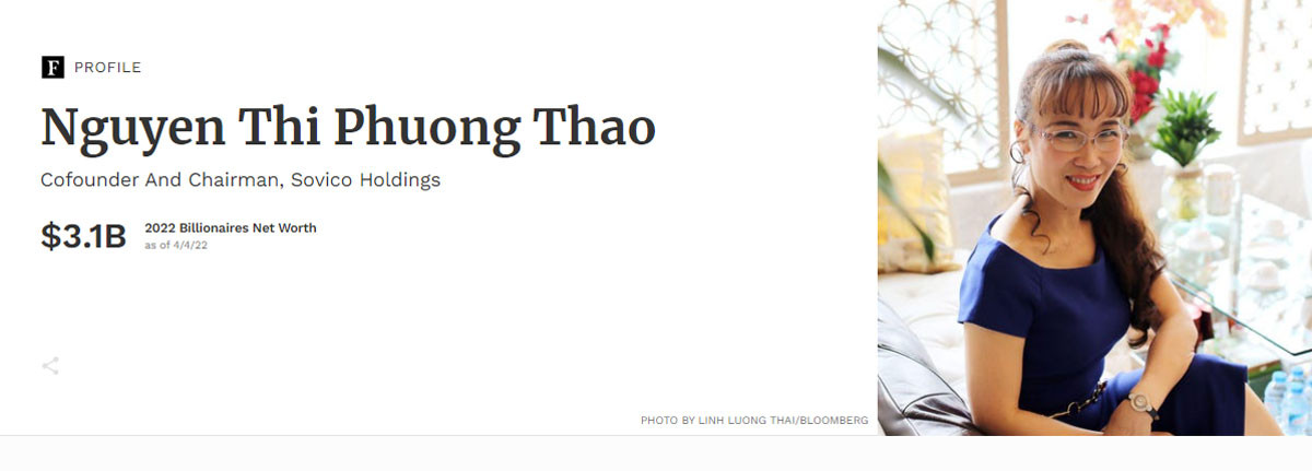 10/03/2023 02:06Forbes dừng cập nhật tài sản tỷ phú USD với bà Nguyễn Thị Phương Thảo