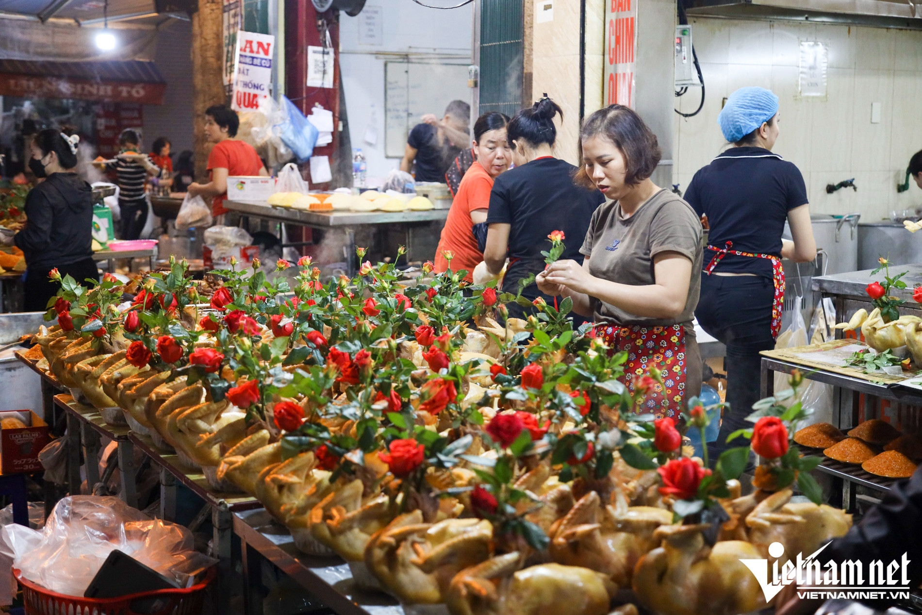 Món gà cúng ngậm hoa hồng rất hút khách dù giá rất đắt, dao động 350.000 - 400.000 đồng/kg. Như vậy, tính ra, mỗi con gà cúng giá trung bình khoảng 500.000 - 600.000 đồng/con.