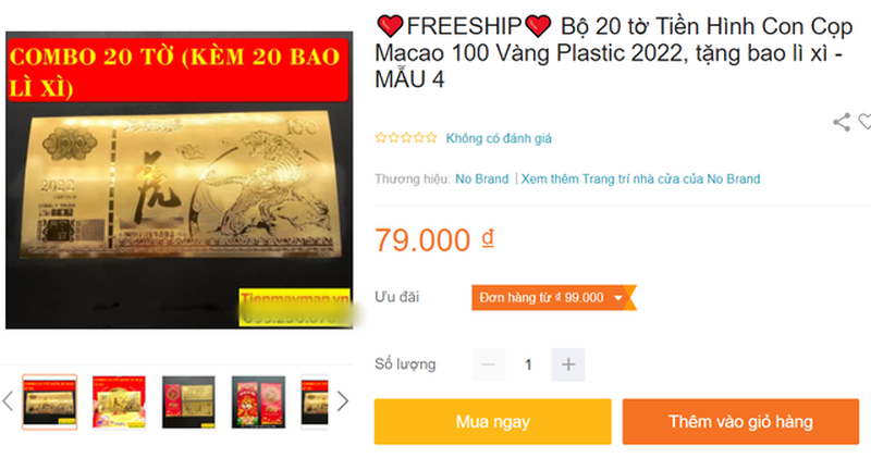 Trong khi đó, tiền hình hổ Macao với thiết kế mạ ánh kim bắt mắt này có giá chỉ khoảng 79.000 đồng/set 20 chiếc. Bên cạnh đó, một mẫu tiền in hình hổ khác của Macao sử dụng chất liệu giấy huỳnh quang thì có giá cao hơn, khoảng 58.000/set 10 tờ.